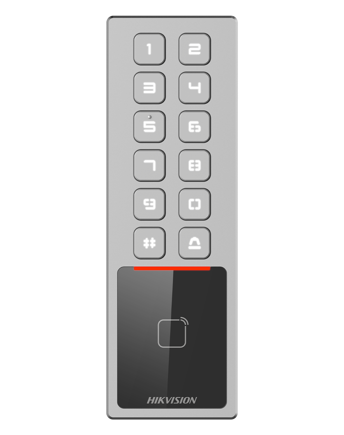DS-K1T805MBWX to kompaktowy terminal kontroli dostępu z obsługą kart Mifare i kodów PIN. Wyposażony w klasyczną klawiaturę numeryczną oraz przycisk dzwonkowy, umożliwia łatwą integrację z systemem alarmowym. Obsługuje do 1000 użytkowników i 1000 kart.