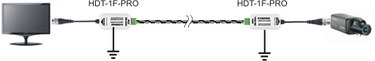 Przykład konwersji sygnału HD na skrętkę UTP i podstawowego zabezpieczenia kamery HD oraz urządzenia odbiorczego z zastosowaniem dwóch urządzeń HDT-1F-PRO